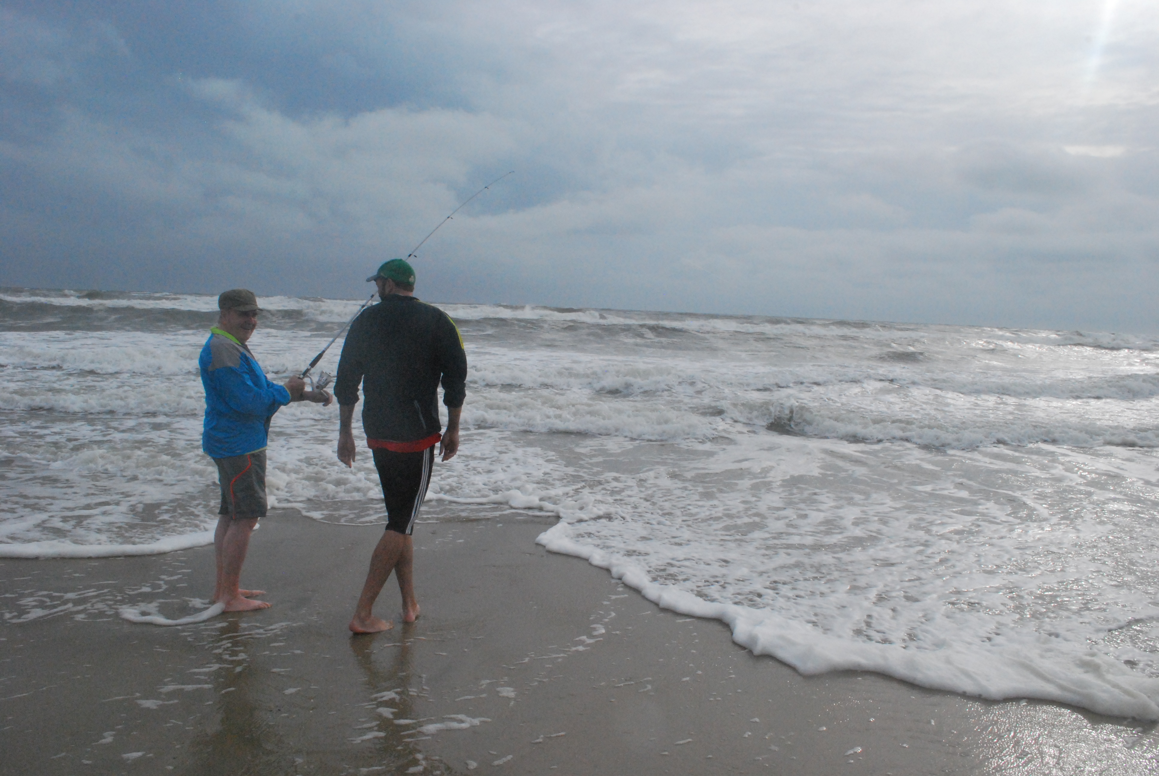 Fishing in Corolla Bay, The Outer Banks, North Carolina. My first try at fishing! The stripey giant on my line is called a DRUM – apparently! I did put it back when I unhooked it!